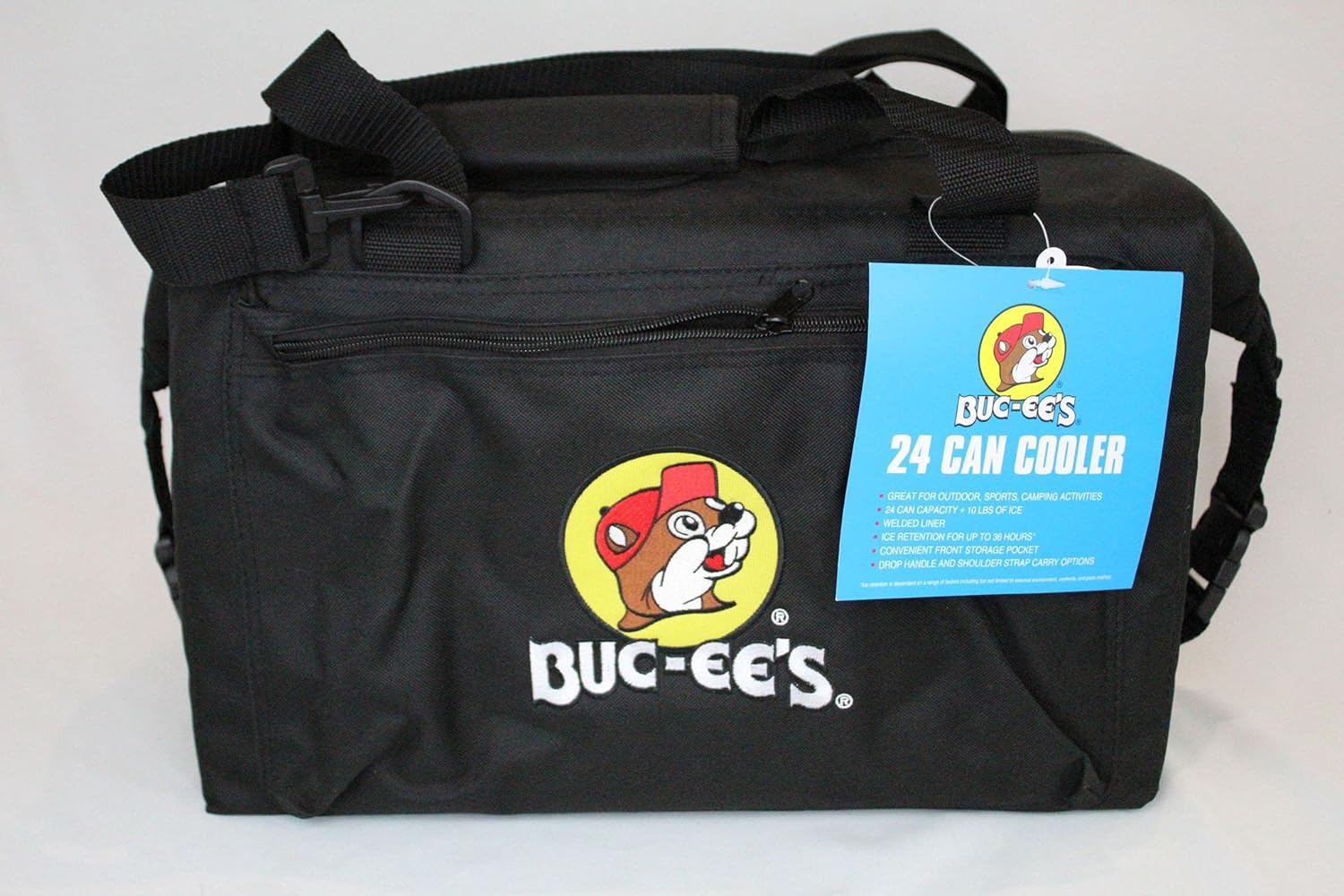 Introducing the Buc-ee's Travelling Leak Proof Cooler Bag, built for your next outdoor adventure! With a 24-can capacity and ice retention of up to 36 hours, this durable cooler keeps your drinks icy cold. Crafted from sturdy 600D polyester and featuring a welded liner, it prevents leaks even in rugged conditions. The convenient front storage pocket and dual carrying options – drop handle or shoulder strap – make transport a breeze. Perfect for camping, sports events, or any outdoor escapade!